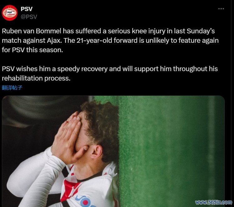 9月22日讯 埃因霍温官方宣布,小范博梅尔遭遇重伤, 最美运动人生很可能赛季报销。