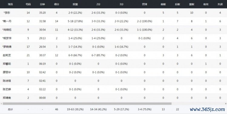 球队方面,全队外线始终打不开局面,远投29投仅5中,命中率17.2%;且攻击 端有些急躁,全场出现20次错误 ;整场厦门女篮仅2次助功 。球员方面,赖一丹拿到全队最高14分另有8篮板球 ,但18投仅5中效率不高;赵莉芝内线终结效率在线,拿下12分6篮板球 ;肖婉钰也拿到11分4篮板球 ;另外李彤和杨梦萍虽然积分 不多,但拼抢篮板球 很是积极,分别拼下10篮板球 (5前场篮板球 )、6篮板球 。