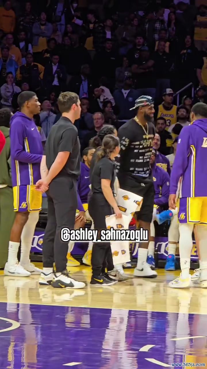 詹姆斯今日场边花絮:假装投射后惬意盘球 从座位跃起庆祝得分