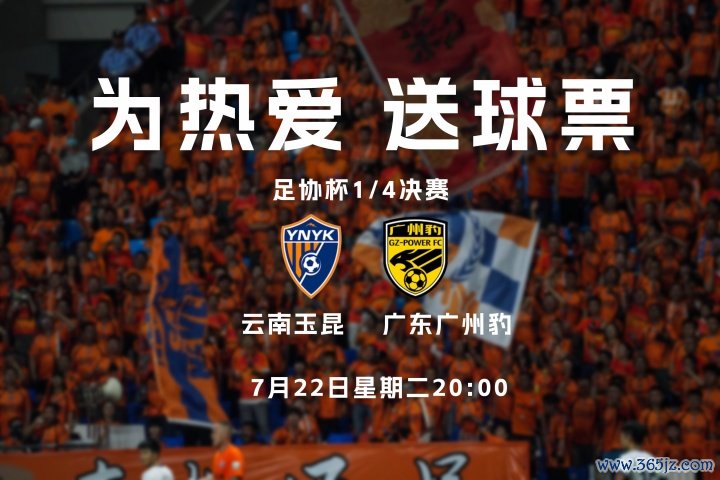 北京时间7月22日星期二20:00,足协杯1/4总决赛 ,云南玉昆坐镇主场作战 玉溪高原运动场 迎战广东广州豹。小吧作为赛事版权方和云南玉昆媒体协同 伙伴,又又又来送球票大礼啦。