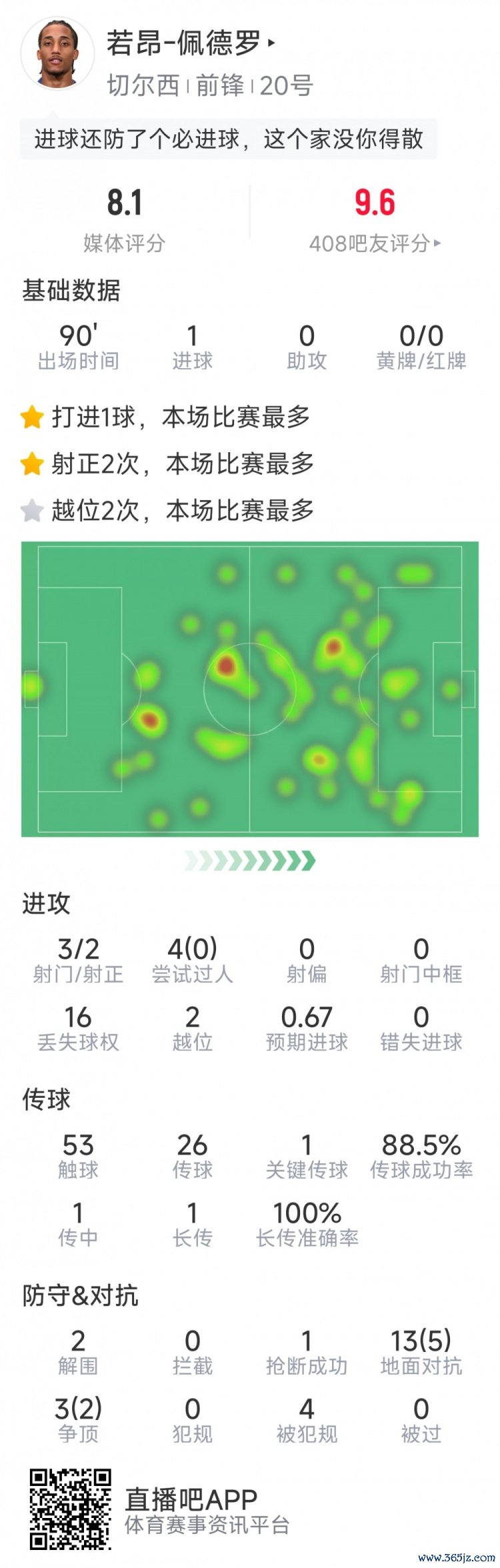 8月30日讯 在本轮英超,切尔西2-0击败富勒姆。本场赛事 若昂-佩德罗再次破门, 羽毛球资讯英超直播以下为他在本场数据:
