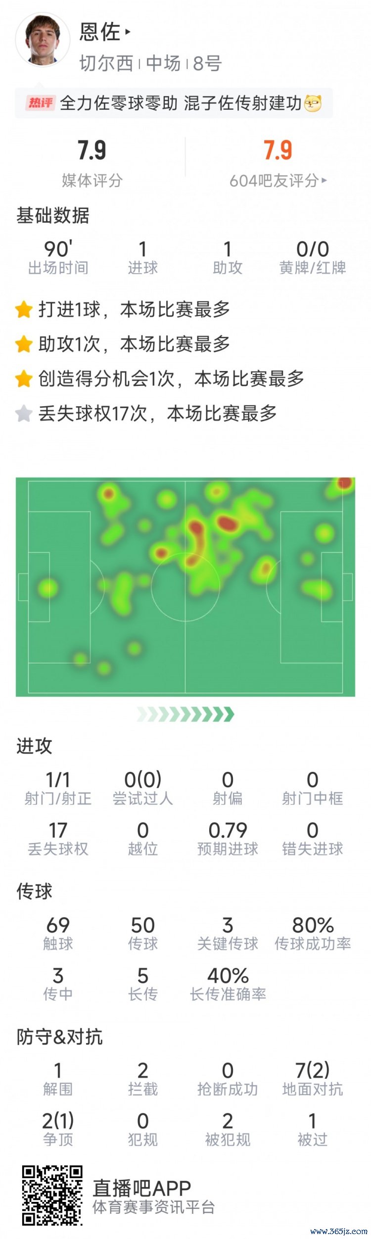 8月30日讯 在本轮英超,切尔西2-0击败富勒姆。本场赛事 恩佐传射建功,探索体育视界直播吧以下为他在本场数据: