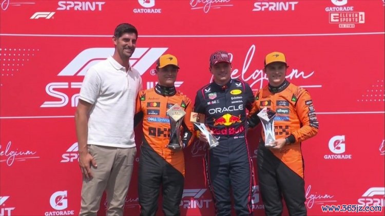 库尔图瓦现场观看一级方程式比利时大奖赛五洲时代, 最美运动人生体育直播并与冲刺跑 赛领奖台司机维斯塔潘、皮亚斯特里、诺里斯合影。