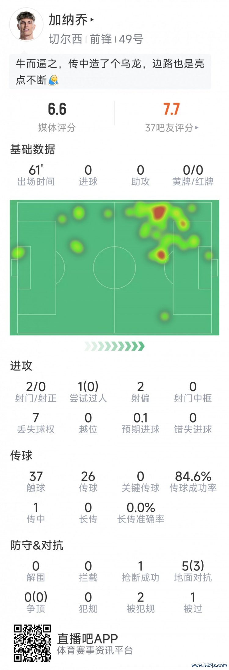 10月1日讯 在本轮欧冠切尔西对阵本菲卡的赛事 中,加纳乔制造乌龙,探索体育视界直播吧以下为他在本场数据:
